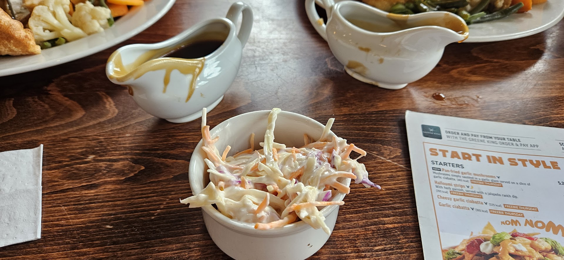 The cauliflower and carrots were practically raw for the roasts, and the other dish (a Super Special Chicken New Yorker) came with hardly any bacon covering the chicken, and next to no BBQ sauce. For a meal that is supposed to contain 1,700kcal, it was looking very anaemic. Further, the coleslaw was missing from the dish, and I had to ask for it to be provided, as intended.
