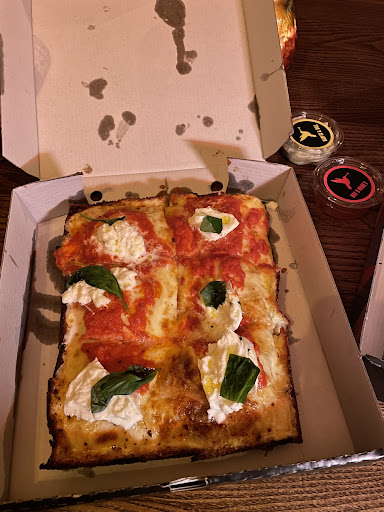 The pizza looked small but it was full of cheese and focaccia. My pizza wasn't cut fully and it was split to 4 pieces. I compared my pizza with other pizzas on Google Maps and other people got much better cuts and 6 pieces. Pieces were way too big to eat them properly without making a mess. Grease was absolutely everywhere and the whole box was very quickly full of it. I have been really full after the whole pizza. It tasted good but ingredients were not the best (specially cheese and pepperoni).