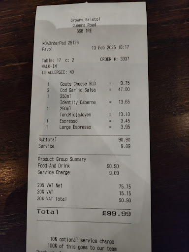 Read moreMy sister organised an Afternoon Tea birthday treat for myself and our younger sister as our birthdays are a month apart at Browns Bristol. My sister not only emailed and phoned to inform them that two of us are Vegetarian and that I cannot eat egg mayonnaise. They assured her that this would not be a problem and that they could accommodate our requirements. I would like say now that if at anytime they had said or emailed that this would be a problem then we would have gone elsewhere. We chose our fruit teas 2 arrived after an hour the 3rd tea arrived about 15 mins later than that after reminding them we were 1 short. When asked if it was the right flavour the waiter actually said the tea pot was on the counter they had smelt it and they thought it was the right one! It soon became apparent when we asked that there were no interesting alternatives to the meat and fish sandwich selection and that they were going to double up on the Cheese and Pickle and Egg Mayonnaise sandwiches for the Vegetarians which was going to be an issue and very disappointing. The cheese and pickle sandwich was pickle with a few grated bits of cheese, photo attached. The egg mayonnaise was not an option for me. They were all made with a margarine spread not butter. So, It seems they do not listen to allergy or dietary requests! The manager said that the kitchens do not have the facilities to make alternative sandwiches and we were offered no alternative from the standard menu, he was most unhelpful throughout our visit. We were never offered a refill of out teas, the staff sniff the teas to make sure it’s the correct one. The manager made no attempt of an apology and the two Vegetarian afternoon teas were barely touched for obvious reasons and to top it all we had to pay the mandatory service charge. I rarely write reviews and I hate to ramble but having had many lovely afternoon teas over the years please do not waste your money on one in...