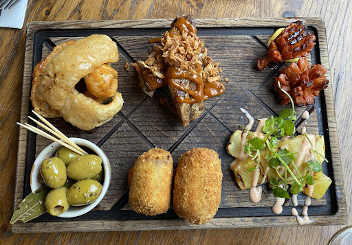 It consisted of salt and pepper Pork rinds, baby back ribs, ox cheek and cheddar croquettes, mini chorizo, poached and charred pineapple olives, and warm bread with whipped butter.