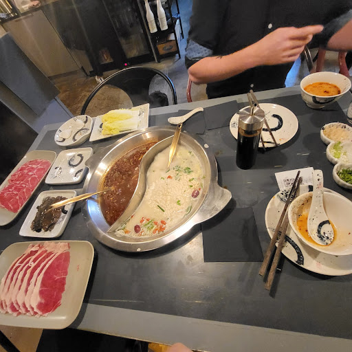 Really excited to try this place but was a little underwhelmed. The decor was very dark for a small space and felt a lttle dirty. The server was lovely but was very softly spoken, so we really struggled to hear what they were saying, even though it wasn't very busy as we were early in the day. I also felt the server spoke directly to my partner only and completely blanked me which was slightly strange. We had the 2 broths and be warned the mild spice is actually VERY spicy. My partner and I can both handle spice but were sweating! We ordered a variety of different foods to try which were all very tasty. It was a little confusing as you are told a lot of information all at once from the server regarding cooking times etc which is very easily forgotten. It would be super helpful to have a card on the table to help you remember. Also, for me personally seperate utensils for the different foods and raw/cooked would have made me more comfortable. We each had 1 set of chopsticks and a ladel in each of the hotpot broths, so it was very difficult to put for example, raw prawns and raw steak into the broths without accidentally using the same utensils as for the cooked meats and vegetables. I didn't really want to use my chopsticks on raw prawns and then eat my cooked food with them. We ended up mostly putting the raw in the broth with our fingers in the end, but then there isn't any antibacterial wipes for your hands which created another issue. We ended up getting through a lot of napkins and I felt dirty by the end of the meal. A simple pair of tongs for your raw meat and seafood would have been ideal. The food was very tasty and enjoyable. I love a food experience but to be honest I left still feeling kind of hungry and I don't think I'd...