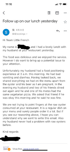 Read moreFood and service was lovely on the day however we won’t go again! So following the email I sent to the team (as attached) on Sunday, I heard back nothing. By next Wednesday I decided to ring the restaurant and just asked how long it would normally take to get a reply. The lady answered my phone said they were only small team so it could be slow. She asked me what my email was about and I mentioned it was about food poisoning. She said something like” oh I saw that and I let the head chef know. We haven’t heard back from any customers who had similar experience.” I was disappointed that the email was read but they did not bother to spare 20 seconds to even just write me an email showing any care, sympathy or just even to acknowledge that they were aware of this and would get back to me. The lady didn’t sound very helpful either although she said “of course we take it very seriously.” I was on loud speaker and my husband also felt they sounded cold, very opposite to the service offered on the day we were there. And it’s Friday now, surprise surprise no reply still. Even my friend who heard of our experience remembered to ask,” did you get a reply from the restaurant yet?” The answer is no. So our answer to this restaurant is also no. My friend who actually recommended this restaurant to us said they wouldn’t go...
