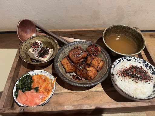 They also put furikake on everything of the lunch set. It looked like furikake, but it is not. It's some powdery chilli flakes and black sesame, and something else (maybe some 7-spice powder...?). Again it's very salty and overpowering. It completely obscured the original tastes of the side dishes and the main dish (I had tofu)... It's not (the point of) furikake. I am not sure why it's there. Garnish? Miss the point!