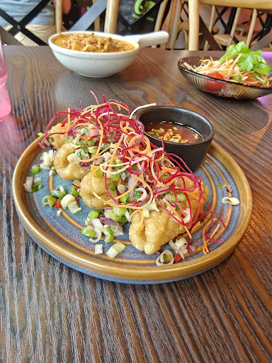 We shared the veggie spring rolls, Thai grilled pork, golden prawn bags, butter chilli prawns, Thai duck red curry, and Pad Thai noodles with chicken. While the Thai grilled pork and Thai duck red curry were our favorites, every dish was expertly prepared and did not disappoint.