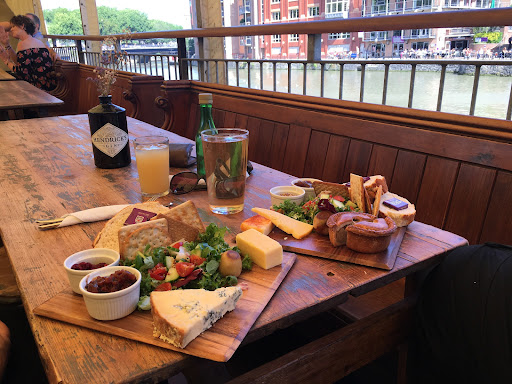 Set on a really simple boat with seats on the cobbles and on board split over two levels we opted for river side seats on the top deck of the boat. After ordering our food and sampling a few ciders at the bar we sat down and waited for the usual long wait during the busy office hour lunch break. We where in for a shock when our ploughmans turned up quite promptly. It was too good to eat and I just looked and it and took some pictures, Which as a non-instergramer I never do!
