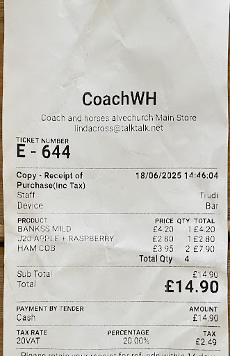 Read moreMe and my partner decided to have the fish and chips at Coach and horses. I did book a table but received no reply. The waitress said that the person that incharge on the booking email wasn't there tonight (I think she's made up this stuff too) When I arrived after sitting at one of the empty tables, just to be told by the same waitress that they are fully booked. The serving time is only until 9pm and that time it was already 8.15pm. Went back down to the bar (my partner was ordering the drinks) and the lady (probably the manager) told us that she will find us a table, and we managed to sit at the table where I first sat. The point that I was getting at is the waitress that was incharged on the restaurant area was lying because she can't be bothered to served another customer that eating in the restaurant's tables. As part of her job she brings in (order to the bar) our new drinks without asking if we want a top up and tonight she's ended up bringing the wrong beer for my partner just by following the glass it was served in. The glass was Stella but the drink that he first drink was Cuzcampo. My partner did not point this out as he do not want the fuss. For the rest of the night there was no other customers turns up at the reseaurant to sit at those empty tables that she claimed "fully booked". Lovely place and the fish and chips was nice and the portion was massive but won't be coming back to eat here again as we don't...