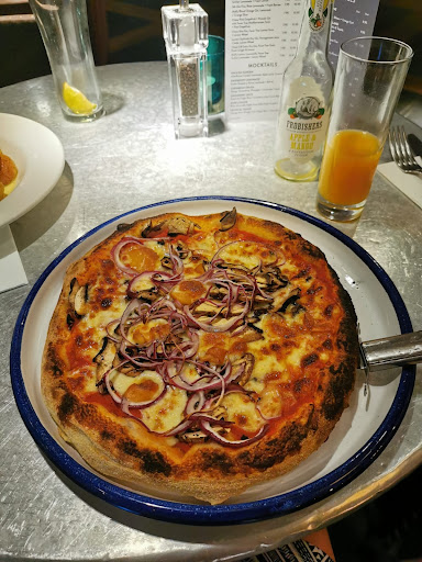 My partner's pizza was nice, a good amount of cheese and lots of beautiful portobello mushrooms. The pizza was not as thin as the one they brought out initially, it was more American style and she preferred a thin crispy base. Both dishes could have maybe been enhanced with some fresh herbs. But, other than that, the staff were excellent and very attentive, the atmosphere was warm and inviting and the...