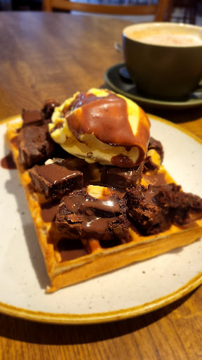 Food I had a chorizo, cheese and chilli mayo toasted chiabatta. Then the Belgiun waffle with ice cream, brownie and chocolate sauce.
