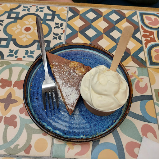 Read moreFantastic place, decor is really vibrant and sets the mood perfectly for a coffee place, Me and my partner dined outside as it was a warmer day and the backdrop of jazz music playing in the background as I tuck into a hot coffee is just perfection in every way to me. Me and my fiancée ordered a few things off their expansive menu, was slightly overwhelming at first but I knew exactly what I wanted when I saw it, I ordered one of their speciality coffees a Flamed Caramel Hazelnut Latte and to go with it it, I ordered a Jamaican Jerk Chicken Panini, my partner ordered a sticky toffee frappe and a bbq panini, for desert we ordered a slice of Malteser cake with cream. The overall waiting time was around 10 minutes which was fine, I could see they were really busy and it was worth the wait entirely, My coffee came out in a sort of crumpled plastic cup design which threw me off at first until I realised that it fits perfectly with the theme of creme brulee coffee, my partners coffee came out with a straw in a glass bottle with a flake and cream on top, the coffee was delicious and was just as sweet as I expected. Our food arrived shortly after in these lovely wooden box designs and came with a portion of sour cream dipping sauce which was made out of blended apples, chilli flakes and onion and was an absolute delight to go with our hot panini's.