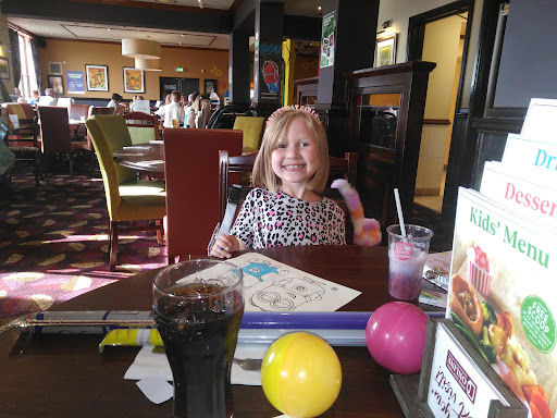 Read moreWe took our 7 year old whose birthday it is today, here tonight as we've been previously and all enjoyed it. After paying £42 for our food after taking around 15 minutes with only one person waiting in front. I advised of certain items I didn't want on a meal beans and tomatoes, the order taker looked to be tapping this in on her screen, I asked can I possibly have more of something else for not having those?...I got ignored as she moved my order on. I then asked about ordering takeout cake, for me to pay then she'll bring it to us when we were about to leave, I've been given a card in the past, then it's just been brought over....she bagged it up and put it on the counter, I said I don't want it now, we're eating! she said it will be ok...I said no, she looked put out about this and said right I'll look after it and placed it under the counter...I had to ask that she refrigerated it. The meals arrive, bangers, mash, peas all eaten happy 5 year old. Childrens cheese and tomato pizza, chips and peas, soggy, sweet, mushy pizza. All day breakfast... Arrived with beans. The last meal....lasagne, mush not browned off enough, undercooked chips, burnt garlic bread...a naff side salad that only consists of dry green leaves, no tomato... Nothing else, I did advise for no dressing thankyou but you can't call that a salad! At one point another table were bring given their meals, their table hadn't been set and many more hadn't, which was a bit strange as I wouldn't consider it to be as busy in the past...the server went off for salt which I past to the table in the meantime as there weren't many about. The order taker came over to ask if our meals were OK as soon as we got them...advised not started yet and the breakfast shouldn't have been should it, you took the order? She apologised. We weren't given the icecream slips so that was a pain...asked for strawberry icecream, given frozen yoghurt....oh my, get us out of this place! It used to be good here, I won't be back for quite a while if ever. Yes we could've taken it up in the restaurant but it was my daughters 7th birthday, it was getting late... Very disappointed. The happy picture is of the birthday girl oblivious that her Mummy and Daddy just know this should be far better!...the picture also shows how quiet it was, sunny day but quiet...