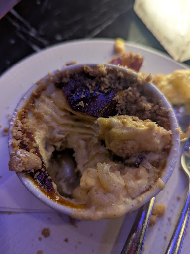 Read moreSoup (tomato and red pepper) and the cheese garlic bread were great. We decided to treat ourselves to the Chateaubriand. Meat was good (though my husband commented it was a little dry on the edges, I personally thought it was ok, good, and cooked medium rare perfectly), onion rings were quite greasy, red wine jus was just ok, peppercorn sauce was poor - had better sauce from a packet mix from the supermarket! The Bearnaise sauce we thought was just melted butter with herbs. For the sides we could choose 2. Dauphinoise potato was great, triple cooked fries were... disappointing. First set were undercooked and still hard so we requested replacements, the second set, Seems the chef over compensated and actually burnt about half of them! Photo. Not really happy, but at least they offered to discount the chips from our bill. Decided to risk a dessert and was met with some horrible crème brulé mash up of apple pie with it [photo]. Brulé (caramel on top) was burned and the combo with the fruit tasted horrible. The crème part was bland and tasted pretty bad - took on a little flavour from the fruit (which is a bad thing). There looked to be flecks of vanilla, but it certainly didn't taste like it. Apparently it was a new and experimental dessert (it's not on the main menu) - hopefully they rethink this combo and don't make it a regular thing. If they do, avoid it!