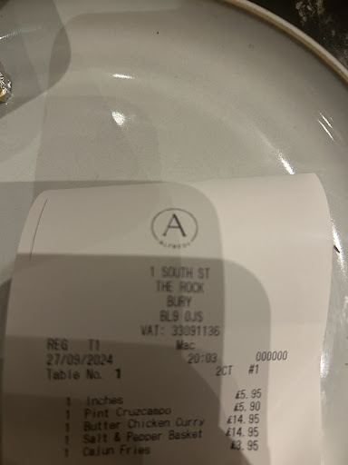 So we saw the Google reviews especially the one from 5 months ago (with photos added) and decided to give Alfreds a go. We often shop in Bury and eat locally. This was our first trip to Alfreds. We booked in advance for 6.15. Arrived around 10 mins early and our table was ready. We ordered and the garlic bread to share came out pretty promptly... Unfortunately that's where the problems began. At 7pm we hadn't received our mains. We asked about this as people who had been seated after us where now being served before us. We were told it wouldn't be long. Another 10 minutes pass and we were approached with an apology that 4 tables (inc a party of 8 that came in after us needed serving first) and our food would follow. A drink was offered. The mains came around 7.40. So almost 1 hour 25 mins from arrival. Also we were aware the tables are booked out at 1 hour 30 min slots as per advertised.