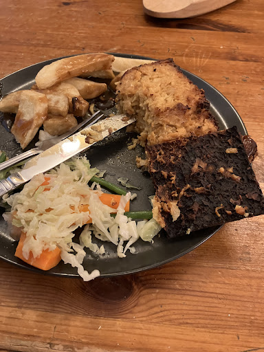 The mash was lumpy and cold, the roast potatoes weren't crispy and the carrots were raw (not al dente, there's a difference). The menu promised "buttered, seasonal veg". The veg was not buttered, nor seasonal.
