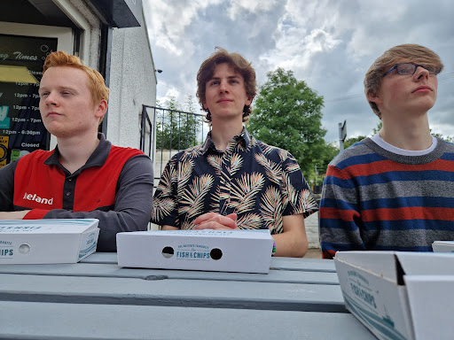Entering the shop with their stomachs all empty, the five guys (not burgers and fries) set their sights on the menu. "A fish and chip it shall be" they all exclaim in unison. "A fish and chip I shall give you" replies Max Povey. And a fish and chip he does, placed into a box, "a tip for you Max Povey", and they're off. Sitting outside in the bitter cold warmed up by the fish and chip as they eat'eth it all down.
