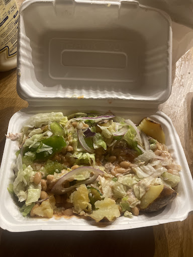 Very large jacket potatos baked to perfection and you can choose a variety of toppings including chicken flake, chicken mayo flake, chilli con carne or chicken steak. Panini's and wraps all available too. Somosas chat also available. All the food (I've tried most the menu) is lovely. If you're feeling a deli lunch or tea ie a panini meal or chicken wrap. It's the place to be . Prices are very cheap and I think they do some deals too like four meals for a certain price. The somosas chat with imbli sauce and onions is like you would expect and served in a little tub. Take aways only no eating in area. Waiting time usually ten to fifteen mins. Kind hard working staff. They also sell the Asian sweets (ladoo jalebi gulaab jamun etc) and party fresh cream cakes of different sizes which you can get something written on like a birthday message for no added cost.
