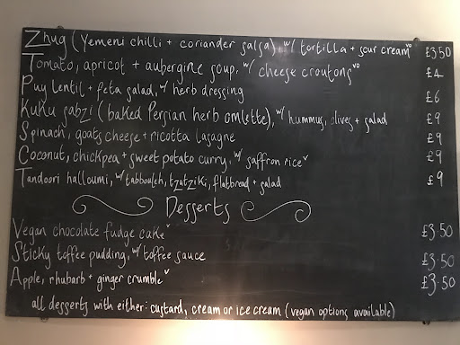 To drink I had mango juice (bottled). I ordered garlic bread which was lovely. I had the coconut, chickpea and sweet potato curry with saffron rice. It was quite bland. I kept adding salt and pepper for extra flavour. For dessert I had the vegan chocolate fudge cake with cream and ice cream, it was pretty good and a big portion which I love! The service was great, the clientele were nice too. As it’s dog friendly, they brought theirs with them!