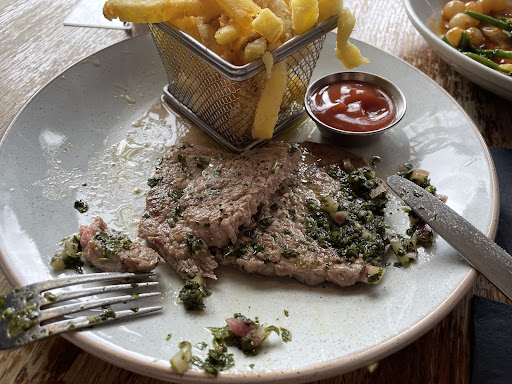 Neither the first nor the second lady offered to replace my dish or make me a new one. They both just reiterated that I ordered steak frites. Yes, they were right, but this was the worst steak I have ever had in a restaurant. They explained that they used a thin steak, but even a thin steak shouldn’t be served like this. When I saw the bill, I was shocked that this chewy steak cost £19. OMG, even at Miller & Carter, a set lunch is £19.99, and it's a thick steak that isn't like bubble gum. Honestly, their thin steak was far worse than an £8 steak from M&S. Oh sorry, I should compare it to Aldi's cheapest thin steak. Yes, their steak frites were worse than Aldi’s cheapest steak.