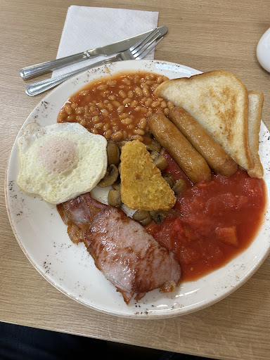 My wife and I were on a nearby stone carving course and staying in a Travelodge. According to Google, this was the only café open at 07:30 on a Sunday. What a great find! I had a large breakfast, and my wife a small. We also ordered takeout sandwiches for lunch. My breakfast, which, amongst the usual 'Full English', included fried bread and fried Spam. Most cafés now offer the inferior American option of hash browns nowadays. None of that cosmopolitan nonsense here. Just masses of great food. Neither I nor my wife needed the sandwiches until we were on our way home at 17:30. The sandwiches, a cheese and salad and a cheese, ham and salad, were once more huge and delicious. All that food and two teas were £20! My wife took half her sandwich to work on Monday for lunch. The service is spot on and fast, the staff are friendly and the café got fairly busy by 08:15. There is limited parking right...
