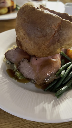 The Sunday lunch menu had a good selection of starters, we opted for salmon gravlax and courgette and chickpea fritters. Both items arrived promptly after ordering. The food was well presented and tasted lovely. For main we had sage and onion pork belly and the tomato and aubergine Wellington, again the food was presented beautifully on the plate. On each plate was two roast potatoes, tenderstem broccoli, a roasted carrot and a portion of cauliflower cheese. Everything was great, the staff brought extra gravy which was delicious.