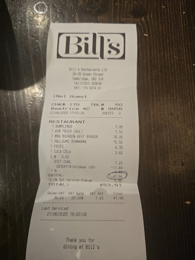 We never got any kind of check back and we felt like we were ignored. As soon as I asked for the service charge to be taken off it was like a different atmosphere everything was short and blunt. As a manager of a restaurant in Cambridge and 5 minutes away from this branch, I was appaled at this level of service and if it happened in my restaurant, letter of concerns would be given out. Each time we come here we always have an issue. Which is a shame as me and my fiancée had our first date here and so it's always been a comfort spot of ours but this meal was the nail in the coffin for us. Im sure we'll go back to bills just not this one.