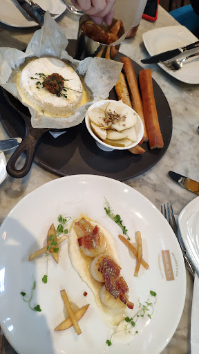 Read moreMyself and three friends visited Brown's Cambridge branch on a Sunday lunchtime. It's not the first time we have been to Brown's; previously, we enjoyed a brunch and, on another occasion, dined on the terrace. We were a bit perturbed as the table we were given was rather small and every chair had a mixture of crumbs and goodness knows what on it. Staff did not offer assistance when we swapped chairs for those of a neighbouring table. I was also put off by the toilet facilities, as there were bloody tissues around the sink... Our waitress was attentive and polite, giving us time to peruse the menu. All orders were brought out in good time. We never felt rushed or ignored. We began with scallops and baked camembert shared between us. The scallops, though minute in size, were packed with flavour. The camembert served with sourdough and apple slices was both salty and sweet with the honey topping. We did, however, feel restricted by the table: despite only ordering two starters between us, they both barely fit on the tiny table. For main, I had pork belly Sunday roast. The meat was generously proportioned, packed with flavour and well cooked. The vegetables (sorry to say) were abysmal: the root veg had no flavour/seasoning while the peas were bitter. Everything was served swimming in a jus, which added flavour but was overly salty. Sitting in the jus, the would-be crisp potatoes went soggy. It would have been better to receive the jus in a pot on the side, so that one could choose how much to pour. A friend had the chicken version of the Sunday roast and shared some of the meat with me, which was very pleasant, and a pig in blanket, which was ok. His was also served swimming in a salty jus and agreed that a side pot would have been more appropriate. Another friend had the fish (cod) and chips, and was satisfied. Hers came with a side of some sort of cabbage (which was not listed on the menu and which did not seem to be added to the bill...) which was dry as heck. For afters, I had a chocolate brownie which was rich and dark; it should have come with a scoop of honeycomb ice cream on top, though in face I was given what was most certainly a rather less exciting vanilla ice cream. The ice cream was enclosed beneath a half-sphere chocolate shell. Another friend had the same but his shell was broken and partial by the time it arrived; a replacement was not offered by staff. The profiteroles enjoyed by another friend were light and creamy while the pineapple and cream (a sort of pina collada idea) garnered positive reviews from the final member of our table. Drinks. I thoroughly enjoyed the old fashioned, made using Woodford Reserve. The Big Drop low alcohol IPA (0.5%) was nice, too - very floral. The negroni was horrible - badly balanced, far too bitter, horrid aftertaste. We would have liked to have been offered tap water with more regularity (especially given the saltiness of the mains). One aspect of our visit we loathed was the noise. The interior is very tall, but is filled with noise: all the time, they have either a pianist playing at a mini grand or music on. Seated just three tables from the piano, you can imagine that we needed to shout at each other just to be heard. All in all, happy with the starters and the desserts; some of the drinks were good; the mains could be good, but were let down by the vegetable cookery and the salty jus which one does not currently have an option of eating or not; really appreciated the wait staff; facilities - including bathrooms, seat cleanliness and level of noise - needs work. Prices. 2x starters, 3x mains, 1x side, 2x soft drinks, 2x low alcohol drinks, 1x beer, 2x...