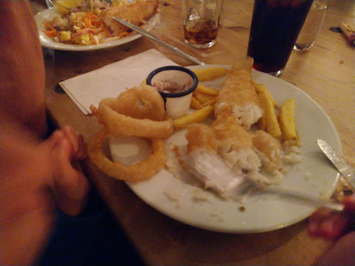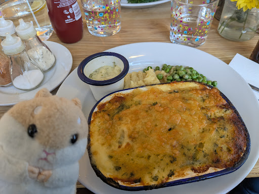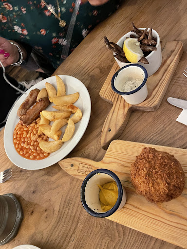 Read moreWe read a guide on the best gastro pub in Cambridge and decided to give it a go considering it's shortlisted amongst the best. As soon as we walked in we were invested by the smell of fish and chips, we thought immediately that it was the right place to have it. We didn't take too long to realise the smell was hotting our clothes and would stay there forever (or until washing them). We had some whitebait and scotch egg to start, my son went for a kids sausage and chips with beans, I took a fish and chips with seaweed batter and curried lime and coriander mayo, my wife for a beef ale pie with sweet potatoes, mushroom and beef tomato. The whitebait were well overcooked, the scotch egg ok, nothing special, my fish was perfectly cooked however the curry in the mayo overpowered completely any other flavour, the samphire were "woody", I had to spit the wood in the centre of them. The steak and ale pie was amazing, my son brushed completely his kid menu. The waitress was amazing, she did apologise for the samphire and offered a different side instead, unfortunately the chef closed the oven (apparently) so he couldn't make what I have been offered, I had to go for a slow, but I wasn't impressed. Service definitely excellent. It didn't look busy so every noise would bounce back twice, a table near us where very loud every time they loose a game on their phone and the bartender managed to smash a glass behind the bar (next to us) feeling like he did on our table. I guess it's more a matter of layout, but with a bit of more attention it could have been in our...