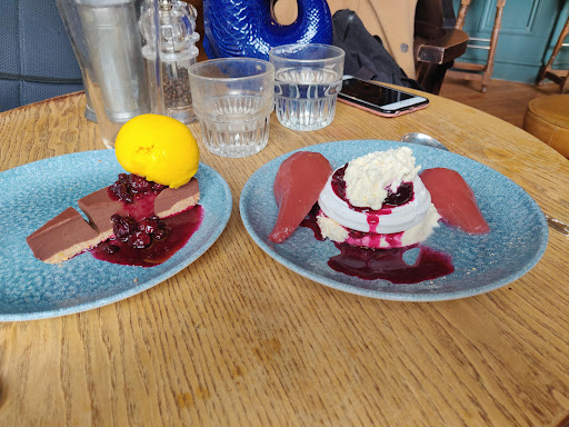 1st VISIT: WHAT WE HAD FOR MON – FRI LUNCH (3 courses for £17.95): Smoked mackerel pate, beetroot, pickled radish & sourdough [£6.75]; VEGAN Roast squash & red pepper hummus, radish, watercress & sourdough [£5.75]; Supreme Chicken with gnocchi, pancetta and sage sauce [£13.25]; VEGAN Roast cauliflower, leek & potato cake, spiced tomato sauce, kale [£10.50]; Winter Pavlova, Vanilla Cream, Mixed Berries, Poached Pear and Meringue [£6.00]; VEGAN Chocolate and Orange Tarte topped with Mango Sorbet [£6.00]
