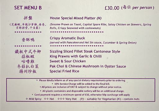 Read moreAt a first glance the atmosphere is clean and plain, regardless, I know it’s going to be good with how much Chinese I hear being spoken. My friend and I settle for the Menu Set B, the most expensive at £27 per person, but it was worth it. The appetizer has 5 different bite sized portions of flavorful, modern, ingenuity Chinese dishes: Grilled skewered chicken with Thai inspired peanut sauce, fall-off-the-bone Cantonese short ribs, sesame prawn on bread toasted, veggie spring roll with a rich dipping sauce and soft crunchy seaweed sweetly seasoned. The rest of the meal has a lot to live up to. Our second appetizer was Chinese pulled pork tacos, garnished with veggies and Hoisin sauce. We knew we were going to come back. The main course was a traditional quadruple whammy supported by a bucket of fried rice. This was a surf and turf fried rice, shrimp and pork, mixed with your usual veggies and egg, no extra seasoning. The sweet and sour chicken, the succulent mushroom and Bok Choi in a light sauce, the shrimp and veggies with a slight spicy kick, and the Cantonese style steak fillet, mesmerized the senses. None of them were extremely flavorful, nor were they bland. The veggies were fresh and appropriately crisp or soft depending on the dish. The fillet steak pleasantly tender, shrimp was firm, and the chicken juicy with a crispy breaded shell. For the given price range we were well catered to with similarities that of a high-end tasting menu. This one is definitely a...