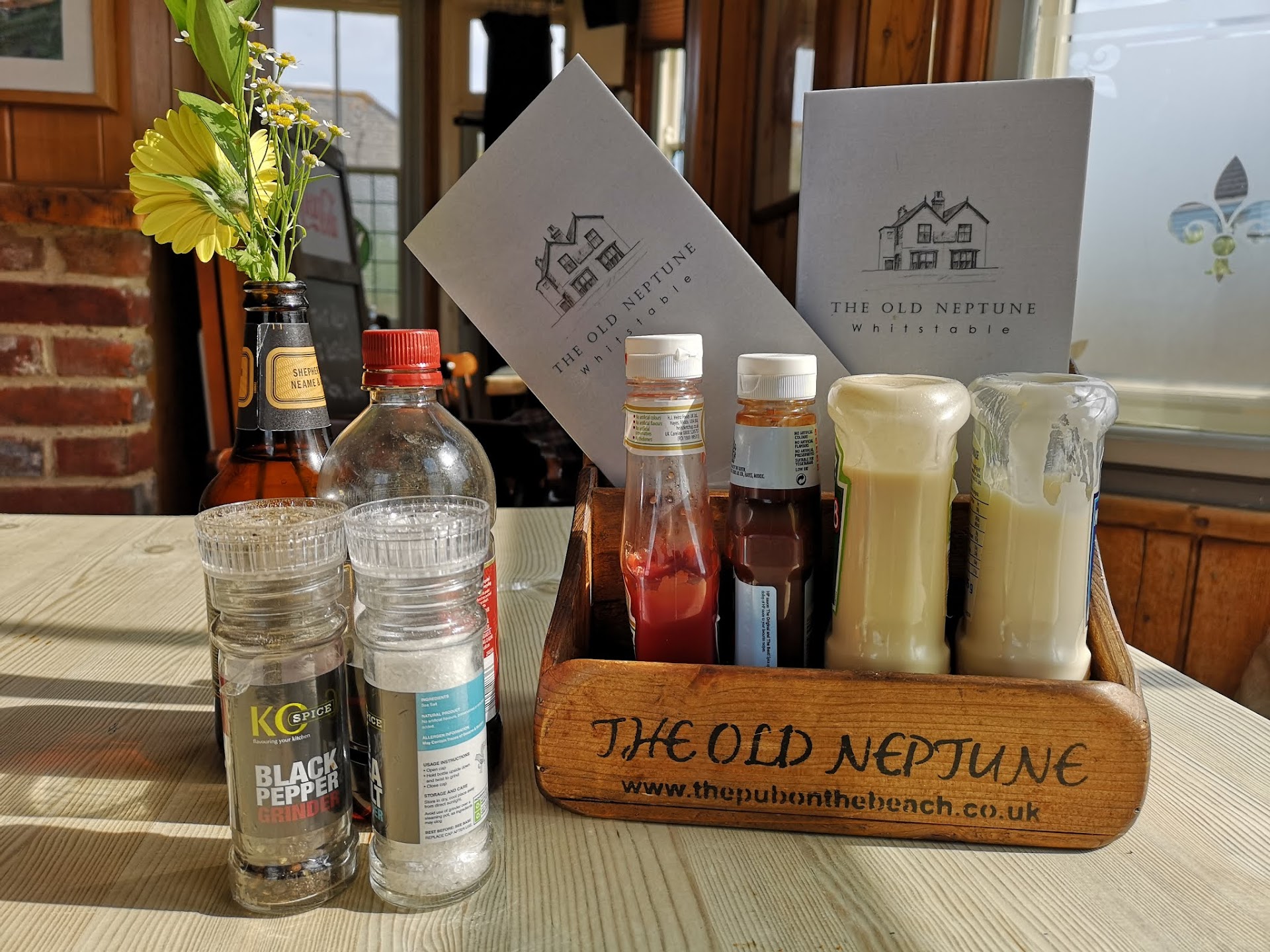 Read moreNice looking old pub right on the sea front, nice local beer, nice location. We walked through the harbour, past all the other great looking food places to get to the Old Neptune pub. We were early so we waited patiently for it to open and serve lunch. What a huge disappointment we had coming, the food was terrible: The tiniest fillet of cod I've ever seen. The average mackerel fillet is bigger. It was mainly batter with a skinny sliver of fish inside. I didn't know cod fillets came that thin. The Fishbox was likened to cheap catering freezer style food. A massive disappointment for two of our group as soon as they opened their boxes. The Scampi was inedible. Hardly any scampi there in the thick oily batter, and what was there was watery mush. All this served in take-away boxes with plastic knives and forks, with the mushy peas in little plastic tubs, and the pub isn't exactly charging take-away food prices!! Menus poorly presented, a plain looking A4 sheet within old scruffy laminated plastic. Specials List presented the same way. But obviously not so "special" if it looks like it hasn't changed in years. The only person in our group who had a decent meal was a vegetarian, who liked the veggie tart. The rest of us were left utterly disappointed and wished we'd stopped at the other places we'd walk past on the way to the Old Neptune pub. It really put a downer on the rest of our visit to Whitstable. I've had better quality food served to me from car trailers in B&Q or Homebase car parks. The only plus: the location and Whitstable Bay beer was served. Sorry, that's our...