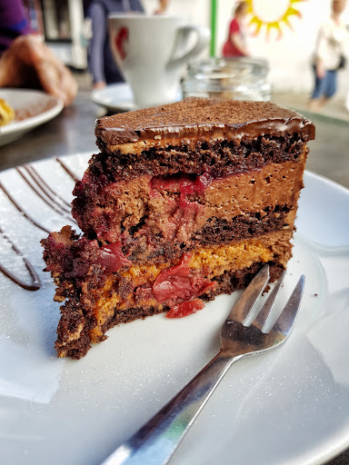 The companion to my Caffe St Eleto at the Chocolate Cafe in Canterbury was a sublime chocolate cake. It wasn't your standard chocolate cake, it was called a Royal Ritz. It had multiple layers of plump cherries, chocolate and something I can only describe as Biscoff paste. It was served with an artistic drizzle of chocolate sauce to give it that extra show of quality. There really are not enough cafes and coffeeshops in the world like the Chocolate Cafe. It's situated perfectly a bit of people watching on the corner of Guildhall Street and you don't feel in a rush to leave. It's high quality, it's reasonably priced and it's a little bit different. It is definitely on my top recommendation list of places to get a drink and cake in Canterbury. Keep up the good work and don't...