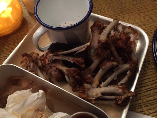 Talking about food, first, as an appetizer, we ordered a bowl of 20 chicken wings and a pair of drinks: a "can-gria" and a red strongbow cider. I love how they presented the can-gria: It is a san pellegrino's can filled to the top with an alcoholic cocktail made of (if I remember it right) orange juice, peach schnapps and wine; it is also topped with some simple but effective gummy sweets. The chicken wings were great, they were cooked perfectly and the quantity over price ratio was incredible: 20 wings for just 6£! They were so delicious that instead of ordering a normal meal as next, we ordered 30 more of those chicken wings. Yes, 30! Obviously matched by another couple of Ciders. ;)
