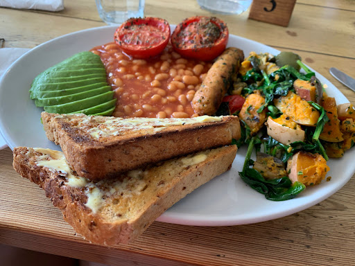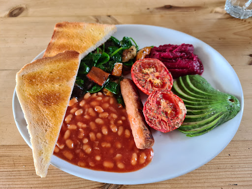 You get, 1 vegan sausage that's very thin, a small portion of beans, hummus (the red stuff on the plate in the photo I uploaded) that's not actually hummus as far as I'm aware, I was told it's 'beetroot flavour'...no idea what it's made from and it tastes a bit sweet. This isn't written in the menu.. That the hummus is something else entirely. I was expecting normal hummus. In the menu it just says, hummus. Kinda misleading imo. Menu needs changing so it specifies what exactly you're buying. So it should state exactly what this 'hummus' is