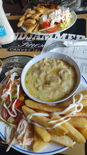 Windjammer. The pub is quite olde worlde with wooden floors and dark wooden bar with lots of interesting niknaks. This isn't a bad thing, just more of an observation. Set out over two floors (only the Upper Deck is open between 11:00 -3:30pm. it serves a good selection of food until 2:15pm. The drinks are good quality and cheap. This is the cheapest place to get a pint of Coors without having to fork out a membership fee. Selected spirits are £2.90 for a double and a mixer. The car park has enough spaces for about 30 vehicles, and it is needed. The pub is situated on the seafront with very limited public transport. Both floors are strictly cash only. Very clean and attentive staff, its one of Canveys...