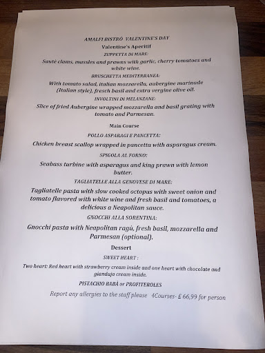 It was Monday and my wife and I wanted to mark a special occasion. I went on Google maps and chose a place with a good rating. Amalfi has a perfect 5 stars and is alone in this in Chelmsford as far as I can see. Now, a surprise. The bistro is situated on a busy business centre near to homebase. Call it an upmarket factory estate if you will, but don't let that put you off. Andrea, the chef welcomed and seated us, took our orders, waited, cooked, served and generally looked after us. He is a lovely man and deserves to get on. The ambiance is just right. There is something interesting to look at in every direction. You can watch him cook, plate up and gives you an intimate experience that you would not get elsewhere. Andrea is obviously proud of his venture and this shows in his attention to detail. I said to my wife at the time, eating out is about the food and not necessarily the surroundings. One can have the most beautiful surroundings and a second rate chef and your experience would be ruined. Fortunately, Andrea really knows his job and this is refected in the high quality of his food. For starters we both shared a bruschetta which actually was a work of art and truly delicious. I had the chicken escalopes in a lemon sauce with chips and the sauce was to die for. I was debating whether in the absence of bread I could soak it up with my serviette and eat the serviette! It was that good. My wife had pasta with prawns. She loved it. We both finished with a Rum Baba each and I had a double espresso to go with it. The coffee was great and the crema perfect. The price was very reasonable, so reasonable in fact that I thought he miscalculated. The whole experience was perfect for us and I do know a bit about cooking being a past chef myself. We will most certainly be back. Thank you Andrea - bellissima 29th November 2024. Went to Andrea's new bistro in Chelmsford centre. The quality of the food remains the same - outstanding, but the ambience has improved 1000% over his previous premises. Better furniture, nicer decor, staff are very attentive. It was a Friday evening and by 8pm the place was packed. Everybody seemed to be enjoying themselves. The current version of Amalfi is much better than the last. The multi storey car park is only 1 min away. Andrea and his staff are certainly doing everything right. We shall be back soon and I have no difficulty recommending Amalfi to all. Thanks for a lovely...