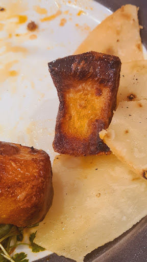 Next up were the sausages, which looked decent on the plate but were surprisingly bland. No seasoning, no real flavour, just a disappointing bite. Potatoes were burnt. Not crispy or caramelized, just overdone to the point of bitterness. Flat bread looked undercooked and very oily, we didn't even want to taste it.