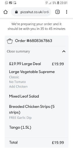 Read moreI ordered 2 pizzas online with the £7 offer for delivery. After an hour of waiting, I rang the Cheltenham branch to see where they were. They thought they were for collection but said they would send it out. Eventually it came but only 1 pizza and the delivery guy tried to charge me for the full amount. The pizza was almost cold too. He said we were out of the delivery zone...only 3 miles away. I wont be using Pizza Hut again and will definitely not recommend them. I've never had this problem with any other pizza company.