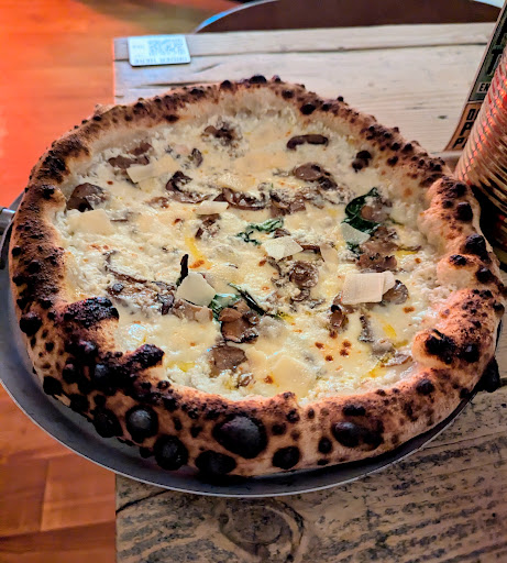The food itself - pizza - was amazing. It was yummy and not overpriced for the quality, we had the upstairs booked for a sports meeting and so was a bit quieter but atmosphere downstairs was good too.