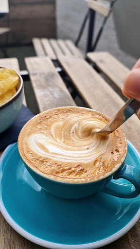 I sat outside because I was overheating inside the shop. It was windy and sunny at the same time. MY FLAT WHITE WAS SERVED WONDERFULLY. I loved it, and whoever made it, you-are- the-best!!! Your latte art is sexy and the way you made it, it is with passion. I liked the toast as well. đ« đ„°