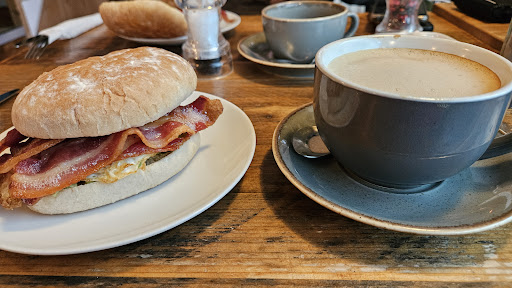 Generally I have recommended this caffe to others, however I get a sense that this customer gets the âchef-of-the-dayâ interpretation of whatâs on the menu. I had previously enjoyed their â Bacon, Brie and Cranberryâ on a Ciabatta Roll , it was exactly that - two generous rashers of meaty (not fatty nor stringy) bacon with a proper amount of Brie spread on a fresh, crusty Ciabatta roll and adorned with dried Cranberries. Today I got, what appeared to be , Chopped Ham warmed in a sloppy white sauce spread on a soft roll ( it was like a stretched bap !) with a smear of Raspberry jam added for effect, ( Iâm not daft; Cranberries donât have Raspberry seeds!? and they are not sweet). Their loose tea is a might weak for my taste, letting it brew longer in the pot only serves to make it bitter, not stronger. In the words of General MacAthur, â I shall returnâ - but they need to up their game if they want to keep this regular...