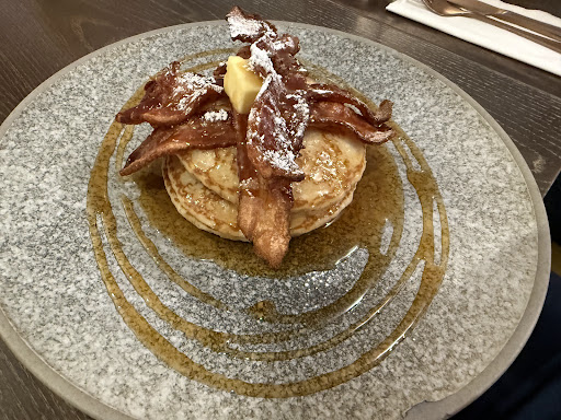 I went for the Bacon and Maple Pancakes, what I know of as a âCanadian Breakfastâ. I did it mostly because I hadnât had pancakes for ages. The pancakes were fluffy, the bacon crispy, and the maple syrup brought all the salty and sweet magic together.