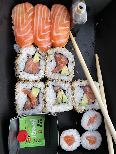Got salmon nigiri, salmon avocado maki and baby salmon maki, with a side of chicken & spring onion gyozas.