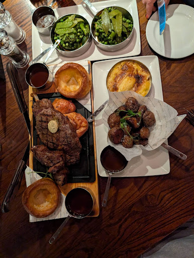 Read moreIt is a chain but it's a little better than your usual Berni/Beefeater type and you pay for it. We needed a last minute Sunday roast after a long day and as it was 4pm, choices were limited. Miller and Carter offer an all day Sunday sharing board for £67 (prices vary at different locations) for two to share. For that you get a hunk of lamb rump, half a chicken and a 12oz ribeye served with roast new spuds, camembert mash, two Yorkshire puds, gravy and veggies. The meats were actually pretty good, the chicken was moist, lamb perfectly pink and the ribeye just hitting a medium rare - enough to soften that connective tissue and fat marbling but not overdone. Gravy was plentiful and had a good meaty flavour, I was quietly impressed with the yorkies (never as good as homemade but actually decent). Not a fan of cheesy mash but judging how quickly my husband demolished it, I'd assume it was pretty good. Roast potatoes were interesting. They were new potatoes boiled than roasted which for a roast traditionalist like me wasn't quite what I was hoping for. But in a time when pub roast spuds are often akin to an Aunt Bessie, these were absolutely acceptable. The veggies were described as sauteed greens and Chantenay carrots and were disappointing. Some floppy broccoli stems, sad mange tout, a few slices of soggy courgette, watery carrots and a load of wrinkly peas did not entice me. Apart from that, it was a good last minute decision. Service was good, venue is fine,...