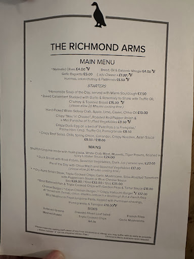 Read moreThe latest reincarnation of the Richmond Arms is superb. Before it felt like a restaurant that sold beer when what I wanted was a pub that sold food so I am glad to see the changes. Some clever redesign has converted the former skittle alley into a bar area and the remaining area now fully utilised as the restaurant. The ambience, service and food could not be faulted with an imaginative if rather limited food selection. Our party had confit duck, lamb shank, pan fried cod and smoked haddock kedgeree all with an adequate portion size. However, while I am happy to give a five star rating there are a couple of constructive comments to consider. 1) Why the need to purchase two additional vegetable side dishes to make a complete and balanced plate. Does it really cost £4 to add potatoes to a meal or is this just a ploy to make the main course appear cheaper on first inspection?? 2) How about adding a couple of lighter lunchtime choices e.g. salads, sharing boards, etc for those that do not want such a dinner style meal?? Congratulations on the changes made and despite a couple of niggles we...
