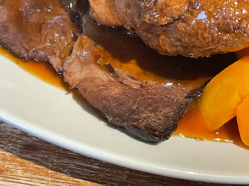 Update: beef was exactly the same and charred and dead again but less of it, the gravy was very lumpy and the yorkshires and potatoes were horrible too, what was worse when the cook came out to discuss our concerns, they were very argumentative and my partner was shouted at and made to feel very uncomfortable. We won't be returning. They did however not charge for 2 of the roasts.