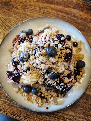 But the French toast absolutely stole the show. Warm blueberry compote, a creamy vanilla cheesecake topping, and a buttery biscuit crumble on top — heavenly. The strawberry oat matcha was another fave, sweet and earthy in all the right ways, and my iced caramel latte was the perfect sipper to round everything off.