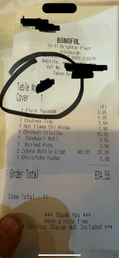 Yes the food was great (almost) as the starter chicken wings was not that good. Curry and the rest was amazing. I'll upload receipt here for yourself to judge. Is it paying £5.50 for 2 popadoms and all the sauces ok ? is it paying £3.50 for small bowl of just boiled rice ok ? is it paying £7 for a Cobra ok ?