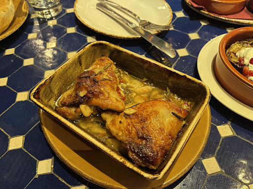 I've had patatas bravas many times in Spain so was excited to see this on the menu. Cafe Andaluz's interpretation of patatas bravas is not as authentic. The potatoes were mushier rather than firm. The calamari was lukewarm and tasteless - like I was eating semi fried rubber. The real head scratcher was the pil pil. It looked appealing and promising but the whole dish was tasteless. The shrimp sat in red oil that was tasteless. There was zero garlic flavor. We were perplexed at how something colorful and vibrant would have no taste?! The only thing that truly redeemed this meal was the pollo y panceta. The garnishes and chimichurri helped enhance the dish.