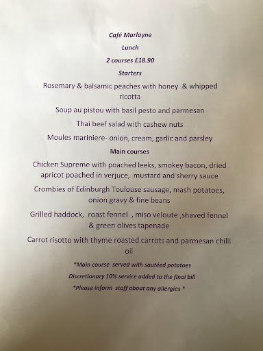 Read moreOne of the loveliest meals we have had recently! Four of us were visiting Edinburgh for the weekend. We enjoyed the meal we had booked at Tattu on the Friday night but had no plans for Saturday. We wanted something a little more authentic and independent feeling. We chanced on Cafe Marlayne and were overjoyed that they could fit us in. The decor and menu were just what we looking for. The reality was even better than we had hoped for. My salmon starter with sorrel sauce was simple but delicious. The duck that followed was beautifully cooked and well-complimented by the cherries. We also loved the pinot noir wine served with the meal. Unusually for us we had desserts and then some additional drinks. There was such attention to detail - and customer service was exemplary. This is a gorgeous restaurant which deserves to do very well - we would certainly return next time we are...