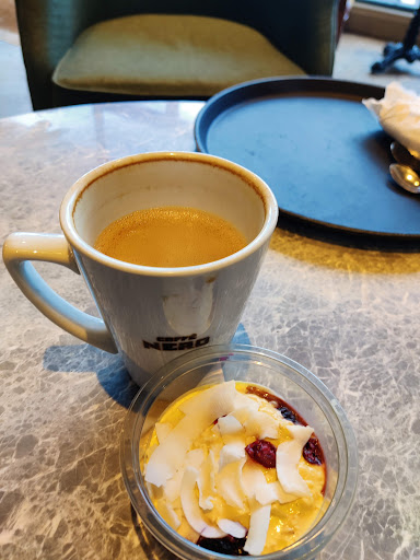My favorite Café at the moment. It's newer, plenty of tables and space, great staff and convenient location. It's got a younger vibe because of the staff, and they are super friendly and helpful (Colin and Reece are the best!), and make great coffee. My go-to is an oat latté but I've tried the cold cherry caramel latté, and the new coffee they are using. One day I asked to reheat my coffee since I'm a slow drinker and Reece surprised me by remaking the whole drink at no charge! The store manager Colin even took the time to explain the difference between all the different kinds and even helped me troubleshoot my charger issue and offered to use one of their cables ;-) They also bake their pastries each morning - I'm enjoying their vegan raspberry croissant, which I don't see often in vegan options in other cafés. There's an array of cakes and sandwiches to choose from, including overnight porridge with yogurt and breakfast buns for, as well as a limited healthy menu (usually salad from what I've seen) such as salads as well. I also love how they have partnered with Vitality and reward physical activity with discounts off the food and a free coffee each week! Plus, you can earn a free coffee with their loyalty scheme right on the app which makes it easy instead of carrying punch cards. And big tip - bring your own thermos and you earn an extra stamp! I never used to go often to Café Nero due to others being so available but now I actively seek them out and prefer them - well, at least THIS location over other well-known names! Please treat the staff with respect and consideration as they deserve to be appreciated for what they do. The fact that they regularly clean the tables and make a point to get to know their clients is refreshing and makes such a difference in the customer experience! I also never felt rushed at this location and could work with pretty reliable internet. Thanks...