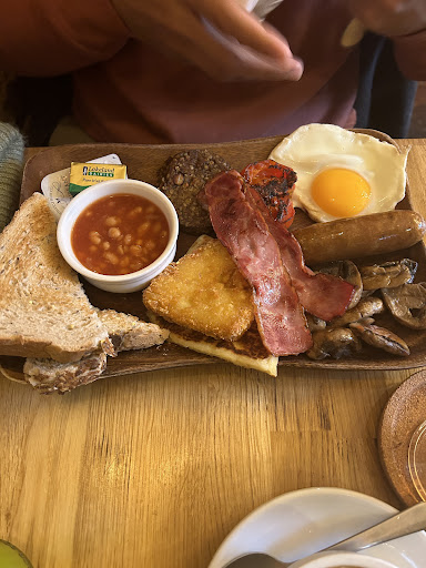 Unfortunately we had a bad experience here. Different than many other places in the UK, this place does not follows the food allergies guidelines and laws. We ordered the Scottish breakfast and informed the server that there were a severe nut allergy in the order and asked if this was a good order for the circumstance. She proceeded to say yes and when the plate came, the haggis had almonds in it. We thankfully saw that before starting eating, called her and asked if it was actually nuts. We were told yes and to just remove it from the plate and keep eating the rest. This is unacceptable to a severely allergic person. It took them 5 times to understand how serious this was. My partner had to leave the restaurant and go back home to take pills and a shower to avoid a reaction. They proceeded to give us a free dessert which was right next to a pistachio desert, so literally learnt nothing.